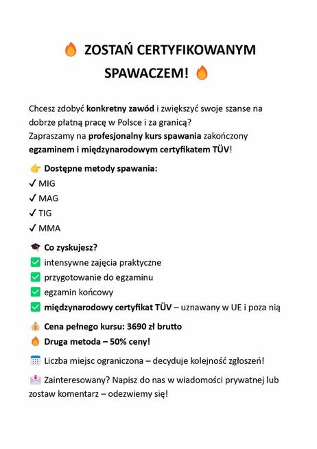 Kurs spawania metodą MIG/ MAG, TIG. Na jednym kursie można zrobić 2-3 metody. Dokumenty respektowane w całej Polsce i ...