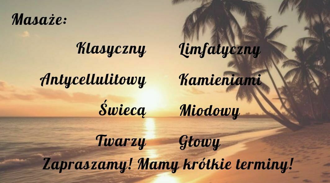 STUDIO MASAŻU RELAKSZaprasza na masaż: klasyczny, limfatyczny, antycellulitowy, miodowy, świecą, gorącymi kamieniami, masaż twarzy i głowy.